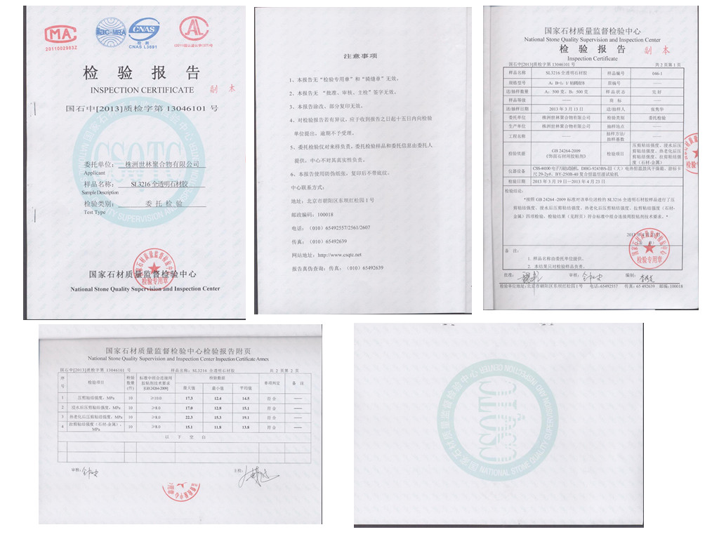 世林膠業(yè)SL3216透明石材膠送國家石材質(zhì)量監(jiān)督檢驗中心檢驗合格