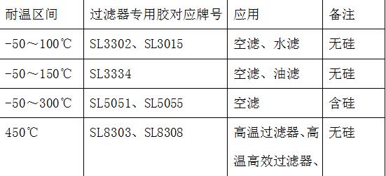 我們將過(guò)濾器專(zhuān)用膠按所需的耐溫區(qū)間來(lái)分類(lèi),供您參考,具體如下表: