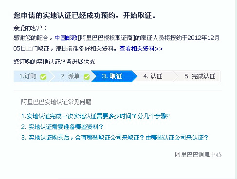 阿里巴巴實(shí)地認(rèn)證服務(wù)分為取證與認(rèn)證兩個(gè)環(huán)節(jié),取證服務(wù)有特定的取證商:中國(guó)郵政和中誠(chéng)信;認(rèn)證服務(wù)有特定的認(rèn)證商:中誠(chéng)信,杭州中德,北京匯華。如果你那的材料齊全,在上門取證后的16個(gè)工作日內(nèi)會(huì)有認(rèn)證結(jié)果(認(rèn)證成功或認(rèn)證失。,并且到時(shí)會(huì)有旺旺浮出提醒。