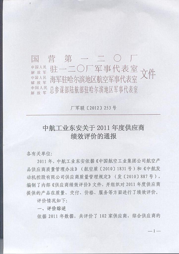 因高溫密封膠產(chǎn)品榮獲國營二0廠(中航工業(yè)東安發(fā)動機(jī)集團(tuán)公司)2011年度優(yōu)秀供應(yīng)商稱號