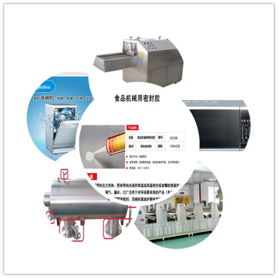 株洲世林膠業(yè)生產(chǎn)的SL5106食品級耐高溫密封膠,是一種單組份食品機械用密封墊,可以用于各種食品機械的平面和法蘭等的密封,它具有優(yōu)良的密封性,長期耐溫可以達到250度,短時可達+300℃。用在產(chǎn)品的間隙處,完全解決了耐高溫,防水,防塵,耐候性強,可拆卸等問題。美的洗碗機上也是用的這款膠水做密封。